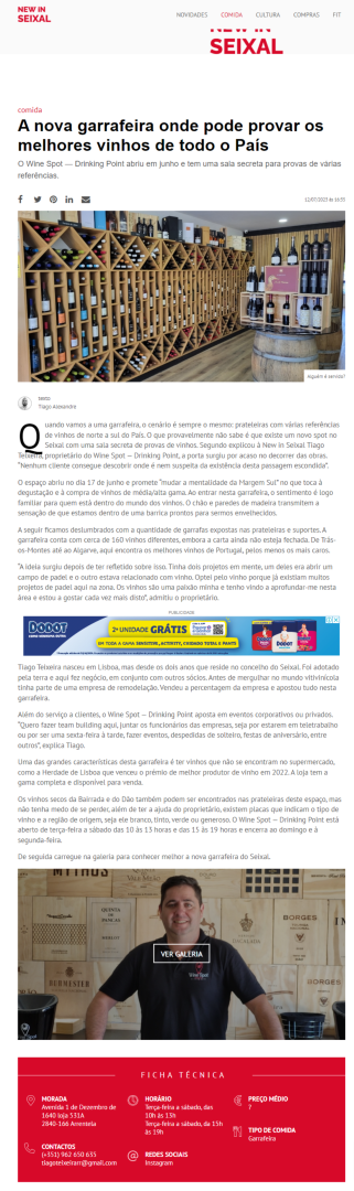 Convidamos todos a ler o artigo completo da New In Seixal e a visitar pessoalmente a Wine Spot – Drinking Point para experimentar tudo o que temos para oferecer. A nossa garrafeira é mais do que um lugar para comprar vinho; é um espaço onde cada garrafa conta uma história e cada visita é uma descoberta.
